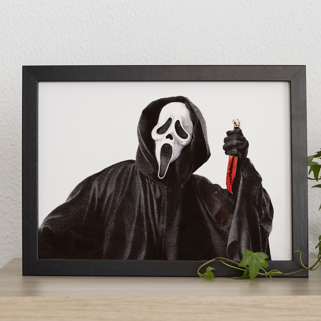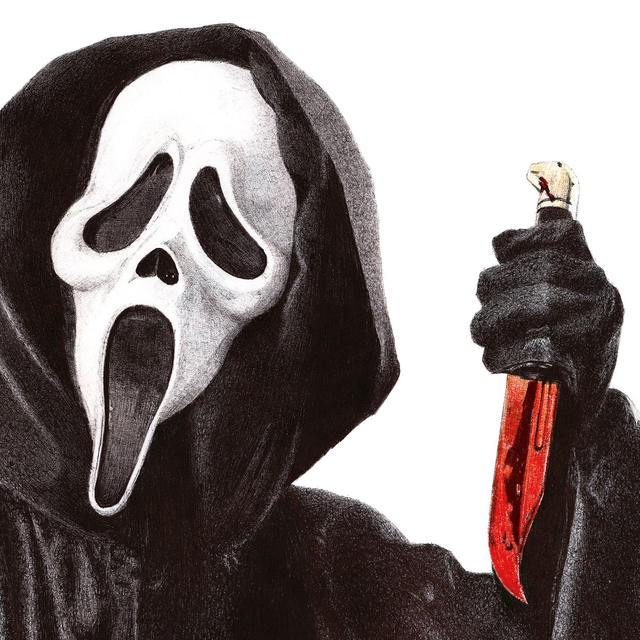 Reproduction de l'illustration originale "Ghostface" issue de la saga de films "Scream" créée par Wes Craven (1996). L’illustration originale a été réalisée sur un papier A4 layout intégralement au stylo Bic, sans crayon, ni gomme. Sa création a nécessité 20h de dessin. Impression laser sur papier blanc lisse format A3 (29,7 x 42cm), 160g. L'impression est vendue sans cadre.