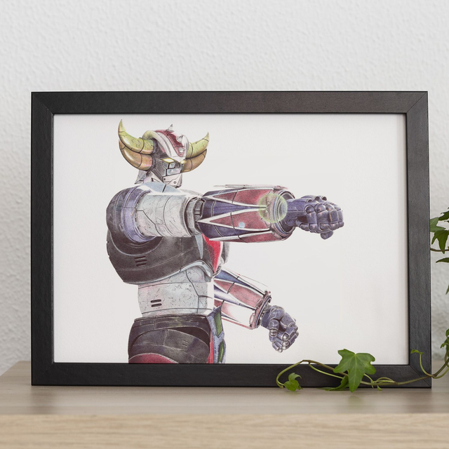 Reproduction de l'illustration originale "Goldorak" issue de la série animée japonaise créée par Tōei Dōga et Toie Animation (1975). L’illustration originale a été réalisée intégralement au stylo BIC sur un papier aquarelle A3+ Moulin du Roy, sans crayon, ni gomme. Sa création a nécessité 45h de dessin. Impression laser sur papier blanc lisse format A3 (29,7 x 42cm), 160g. L'impression est vendue sans cadre.