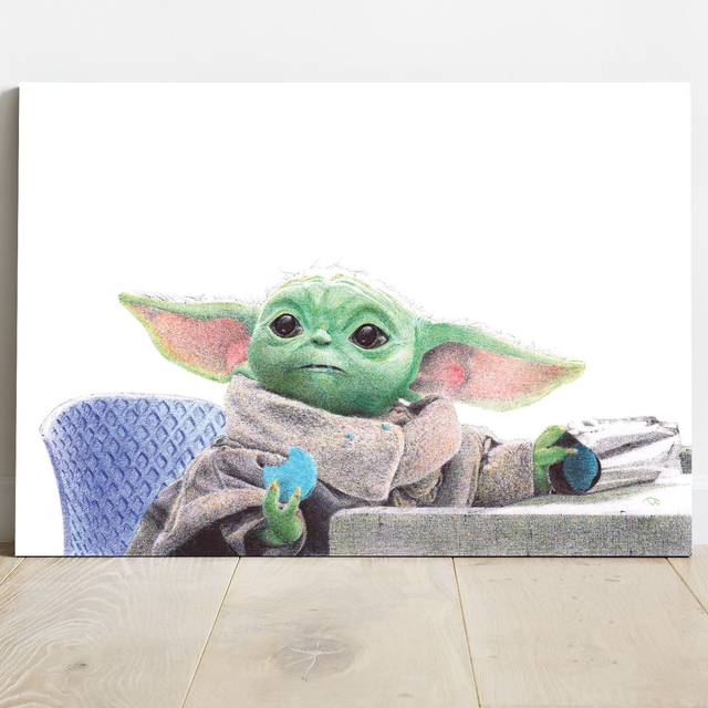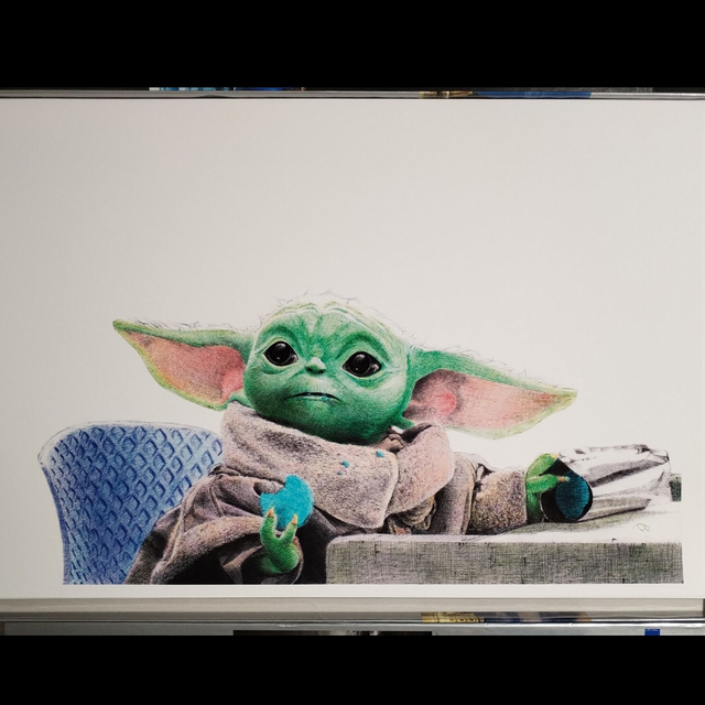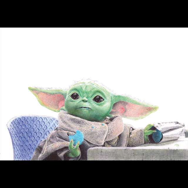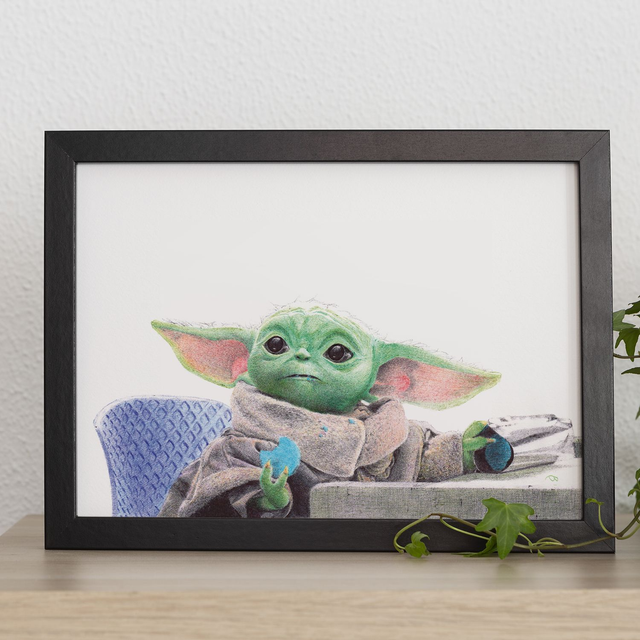 Reproduction de l'illustration originale "Grogu" inspirée de la série-tv "The Mandalorian" créée par Jon Favreau (2019). L’illustration originale a été réalisé sur un papier A5 intégralement au stylo Bic, sans crayon, ni gomme. Sa création a nécessité 22h de dessin, de la main gauche à la suite d’une blessure à la main droite. Impression laser sur papier blanc lisse format A3 (29,7 x 42cm), 160g. L'impression est vendue sans cadre.