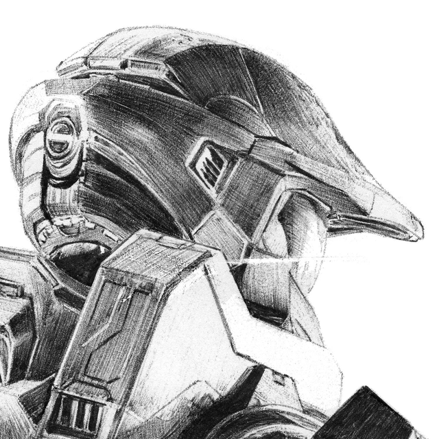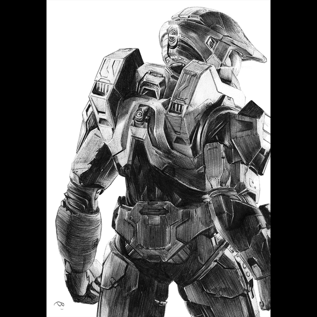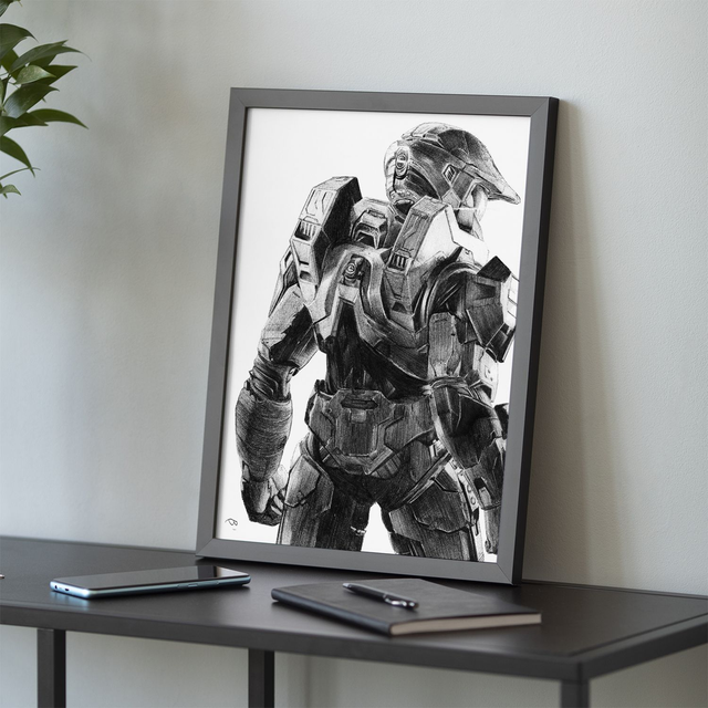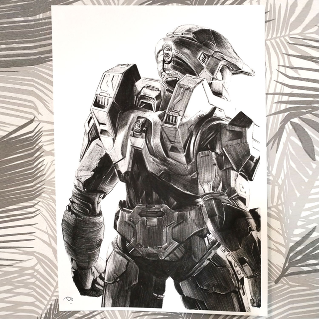 Reproduction de l'illustration originale "Masterchief" inspirée de la saga de jeux-vidéo "Halo"développée par Bungie (2001). L’illustration originale a été réalisé sur un papier A5 intégralement au stylo Bic, sans crayon, ni gomme. Sa création a nécessité 80h de dessin. Impression laser sur papier blanc lisse format A3 (29,7 x 42cm), 160g. L'impression est vendue sans cadre. Disponible en édition limitée à 25 exemplaires en tirage d’art accompagné d’un certificat d’authenticité.