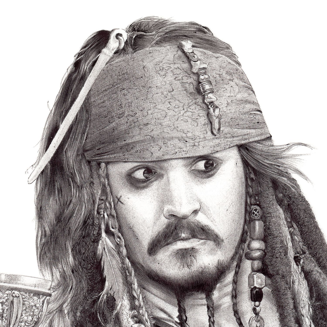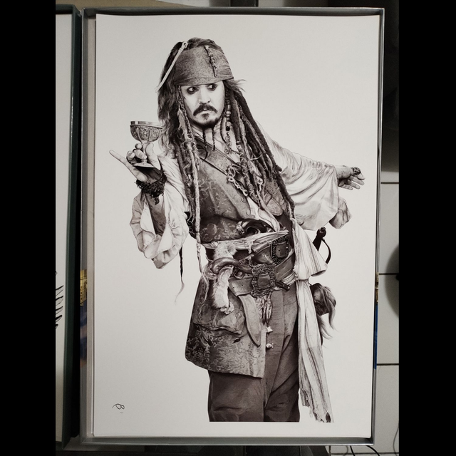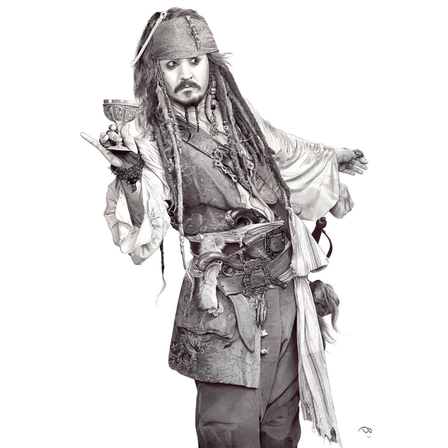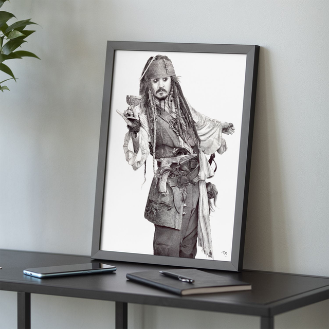 Reproduction de l'illustration originale "Jack Sparrow" inspirée de la saga des films "Pirates des Caraïbes" créée par Gore Verbinski (2003). L’illustration originale a été réalisé sur un papier A3+ (48x33cm) intégralement au stylo Bic, sans crayon, ni gomme. Sa création a nécessité 117h de dessin (le plus long au jour d’aujourd’hui). Impression laser sur papier blanc lisse format A3 (29,7 x 42cm), 160g. L'impression est vendue sans cadre. Disponible en édition limitée à 25 exemplaires en tirage d’art accompagné d’un certificat d’authenticité.