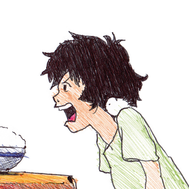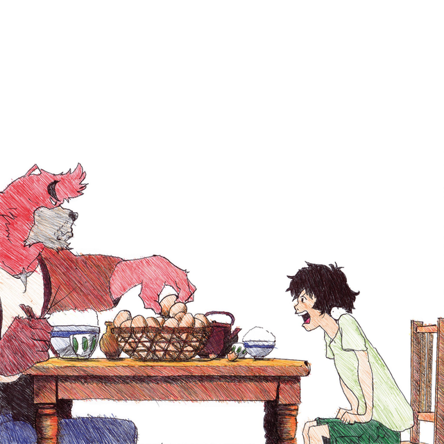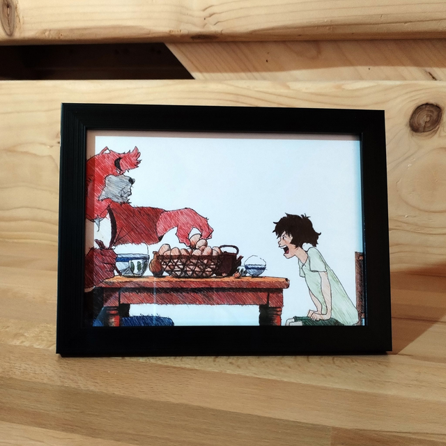Reproduction de l'illustration originale « Kyuta » issue du film d’animation japonais "Le garçon et la bête" réalisé par Mamoru Hosoda, animé par le studio Chizu et sorti en 2015. L’illustration originale a été réalisée intégralement de la main gauche au stylo BIC sur un papier format A5, sans crayon, ni gomme. Suite à une blessure à la main droite, l’illustrateur a dû apprendre à dessiner de la main gauche. Sa création a nécessité 2h30 de dessin.