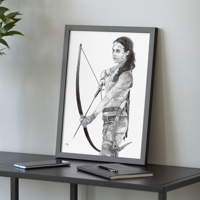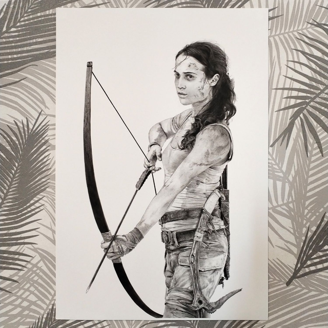 Reproduction de l'illustration originale "Lara Croft" inspirée du film "Tomb Raider" crée et réalisé par Roar Uthaug (2018). L’illustration originale a été réalisée sur un papier A3 intégralement au stylo Bic, sans crayon, ni gomme. Sa création a nécessité 39h de dessin. Impression laser sur papier blanc lisse format A3 (29,7 x 42cm), 160g. L'impression est vendue sans cadre. Disponible en édition limitée à 25 exemplaires en tirage d’art accompagné d’un certificat d’authenticité.