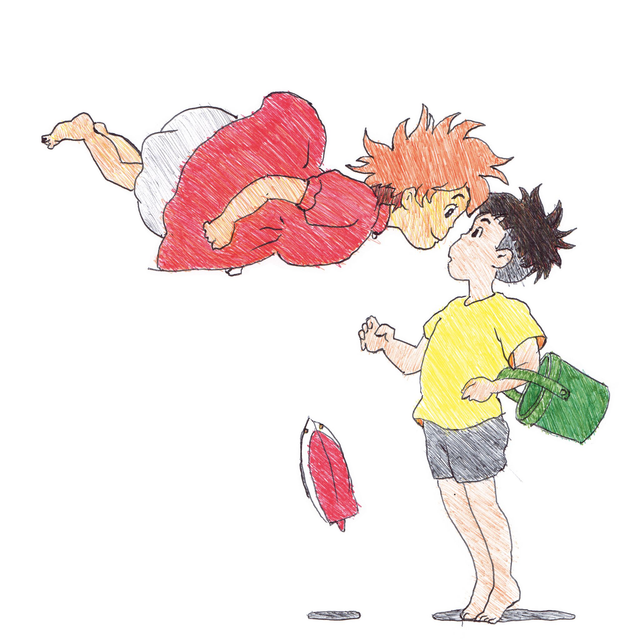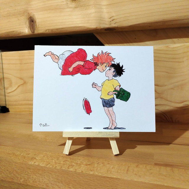 Reproduction de l'illustration originale « Ponyo » issue du film d’animation japonais "Ponyo sur la falaise" réalisé par Hayao Miyazaki, animé par le studio Ghibli et sorti en 2008. L’illustration originale a été réalisée intégralement de la main gauche au stylo BIC sur un papier format A5, sans crayon, ni gomme. Suite à une blessure à la main droite, l’illustrateur a dû apprendre à dessiner de la main gauche. Sa création a nécessité 1h00 de dessin.