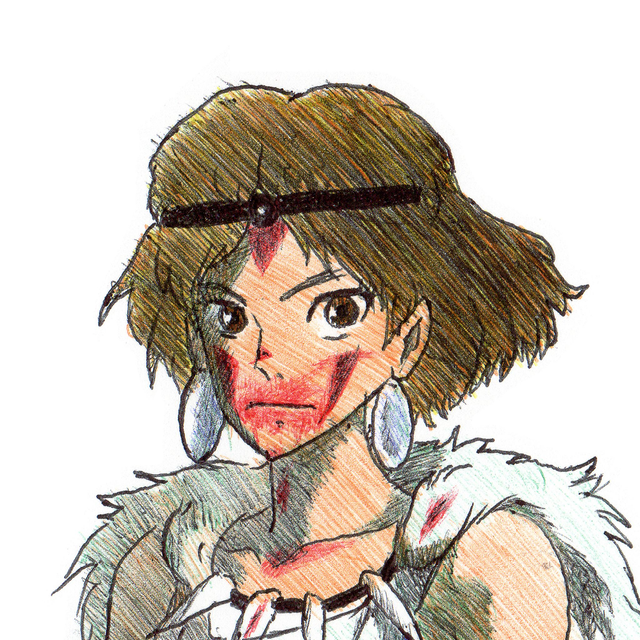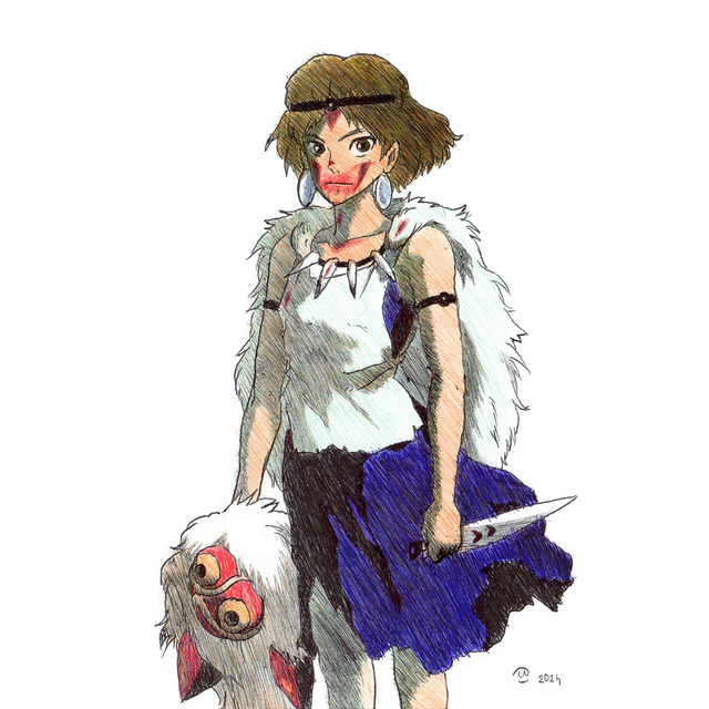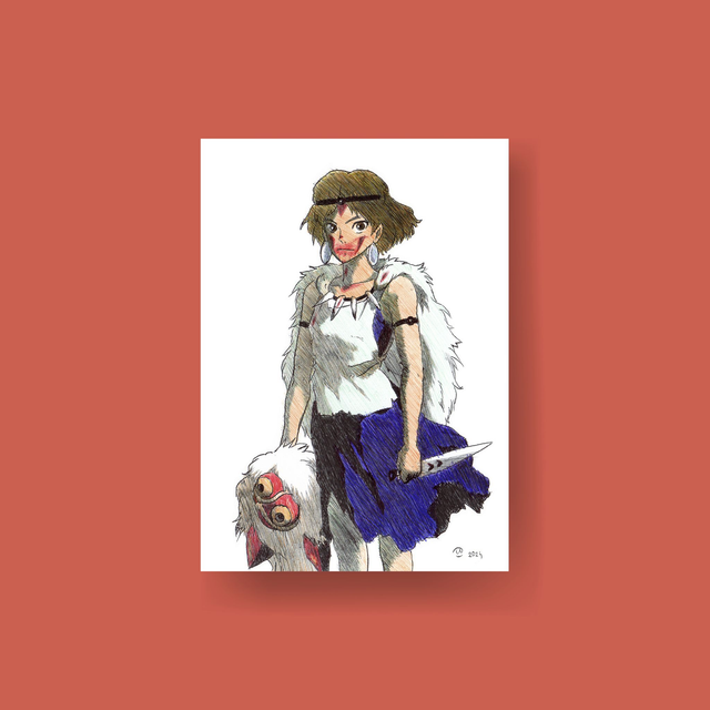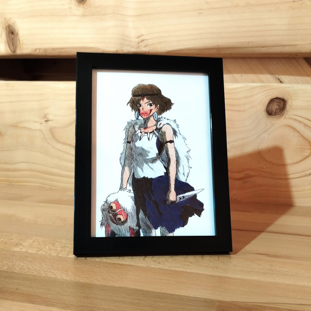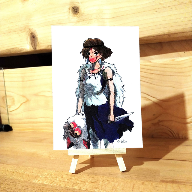 Reproduction de l'illustration originale « San » issue du film d’animation japonais "Princesse Mononoké" " réalisé par Hayao Miyazaki, animée par le studio Ghibli et sorti en 1997. L’illustration originale a été réalisée intégralement de la main gauche au stylo BIC sur un papier format A5, sans crayon, ni gomme. Suite à une blessure à la main droite, l’illustrateur a dû apprendre à dessiner de la main gauche. Sa création a nécessité 3h30 de dessin.