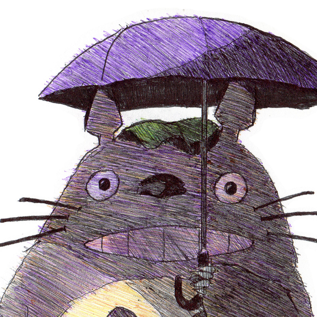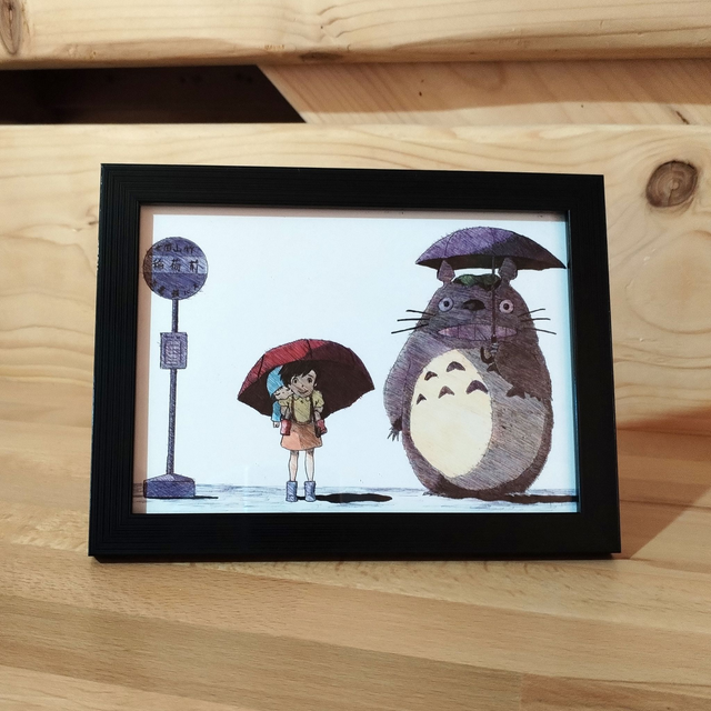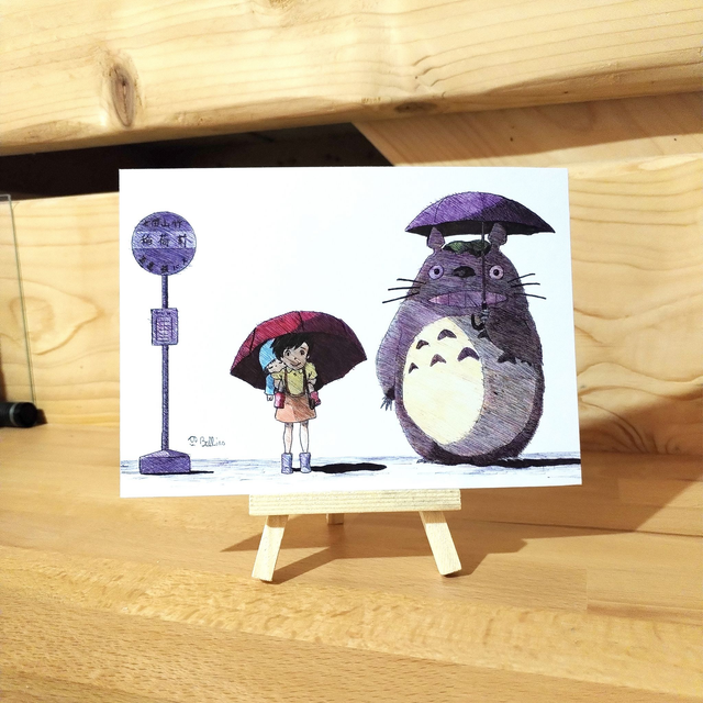 Reproduction de l'illustration originale « Totoro » issue du film d’animation japonais "Mon voisin Totoro" réalisé par Hayao Miyazaki, animé par le studio Ghibli et sorti en 1988. L’illustration originale a été réalisée intégralement de la main gauche au stylo BIC sur un papier format A5, sans crayon, ni gomme. Suite à une blessure à la main droite, l’illustrateur a dû apprendre à dessiner de la main gauche. Sa création a nécessité 4h30 de dessin.