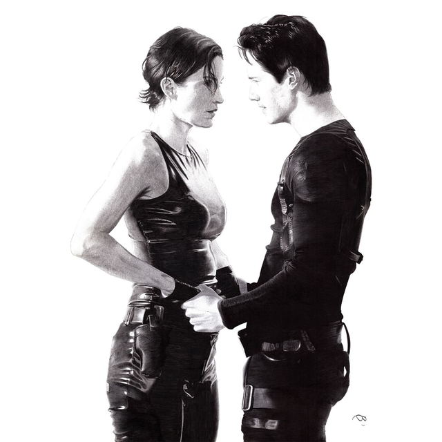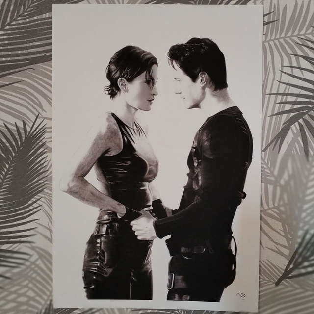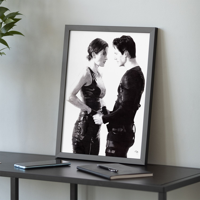 Reproduction de l'illustration originale "Trinity & Neo" inspirée de la saga de films "Matrix" crée par les Wachowski (1999). L’illustration originale a été réalisée sur un papier A3 intégralement au stylo Bic, sans crayon, ni gomme. Sa création a nécessité 64h de dessin. Impression laser sur papier blanc lisse format A3 (29,7 x 42cm), 160g. L'impression est vendue sans cadre. Disponible en édition limitée à 25 exemplaires en tirage d’art accompagné d’un certificat d’authenticité.