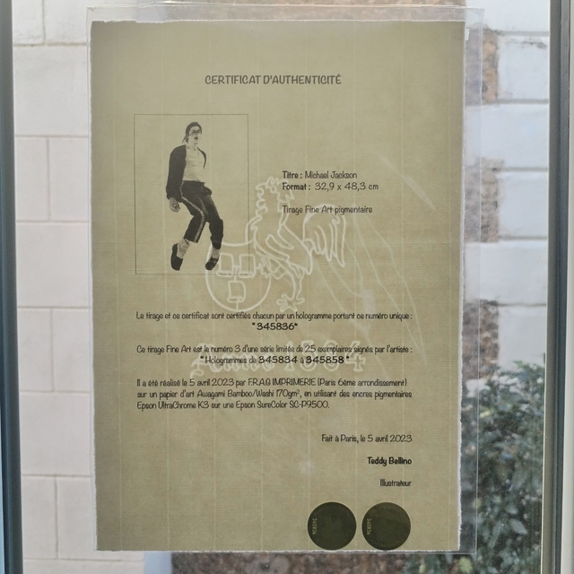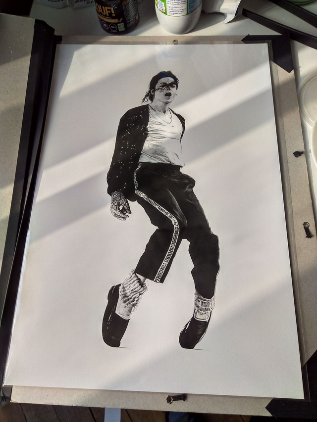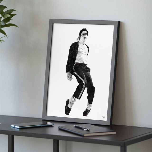 Reproduction de l'illustration originale "Michael Jackson" issue de Michael Jackson. L’illustration originale a été réalisé sur un papier A4 intégralement au stylo Bic, sans crayon, ni gomme. Sa création a nécessité 8h de dessin. Impression laser sur papier blanc lisse format A4, 160g. L'impression est vendue sans cadre.